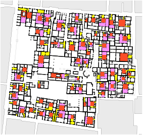 Plan of a block formation consisted of courtyard houses and Section of a house including a existing Hindu temple (Varanasi, India)